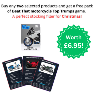 Buy any two products from the following range and we’ll throw in a free pack of Beat That! Iconic Motorcycles card game. Just like the Top Trumps of old, this fast-paced game uses skill and judgement to beat your opponents and be the first to collect all the cards.